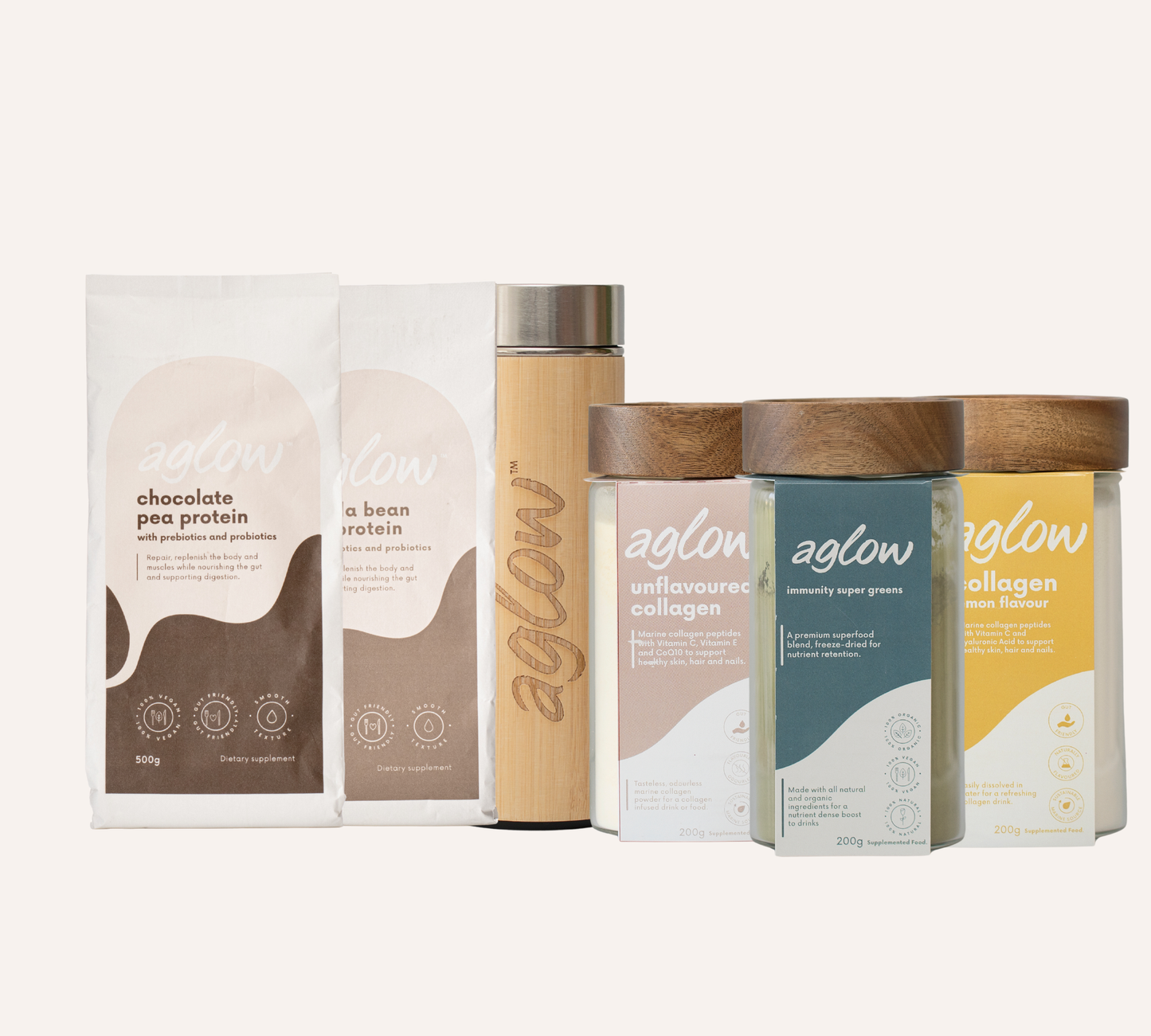 Buying Aglow bundles is a great way to save money, with up to 38% off the regular price. They are the perfect way to start your health, wellness and self-care journey with Aglow, or be able to restock your favourite products easily. Most Aglow bundles include a free gift with purchase valued at $34.99.