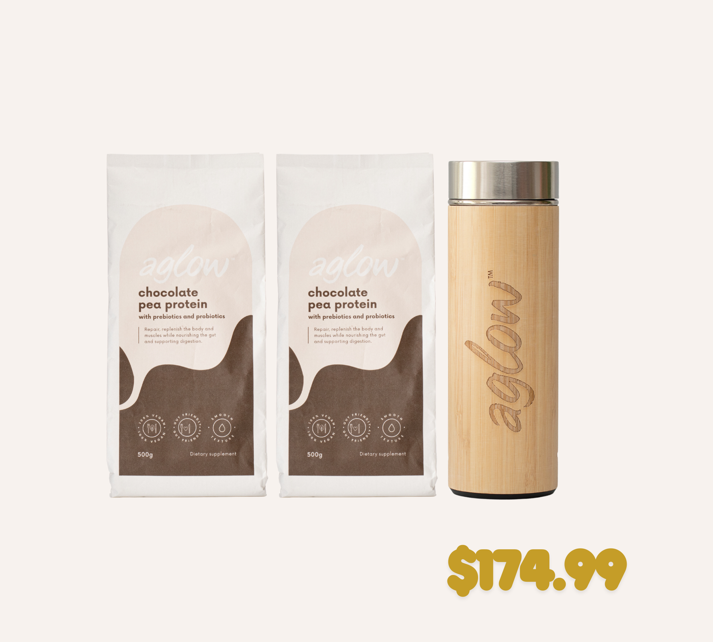 Get the best out of your workout, promote muscle repair and growth, nourish your gut to glow inside-out with Aglow Pea Protein powder with prebiotics and probiotics. This powder is premium quality with over 15g of easily-digested vegan protein in every serve, AND has the added benefit of nurturing a healthy gut and minimizing bloating, with added prebiotic and probiotics.